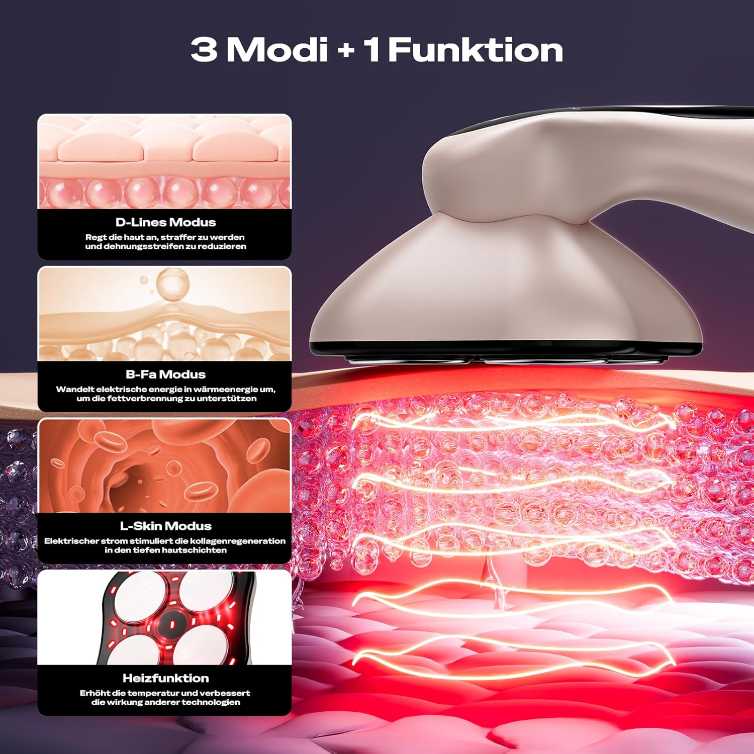 - 3-in-1 Massage-Modi: D-Line (Dehnungsstreifen-Reduktion), B-Fat (Cellulite-Reduktion), L-Skin (Hautstraffung)