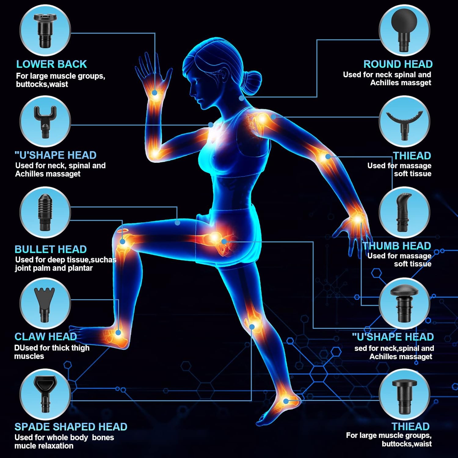 Ein wesentliches Merkmal der Zerolia Massage Gun ist ihre außergewöhnliche Vielseitigkeit, die durch die mitgelieferten 10 hochwertigen Massageköpfe aus medizinischem Silikon und robustem Kunststoff erreicht wird. Jeder Kopf ist speziell geformt, um unterschiedliche Muskelgruppen gezielt und effektiv zu behandeln. So steht beispielsweise der runde, flache Kopf für großflächige Massagen der Oberschenkelmuskulatur oder des Rückens, während der spitze Fokus-Kopf gezielt auf Triggerpunkte und hartnäckige Verspannungen in kleineren Muskelbereichen wie dem Nacken oder der Schulter wirkt. Der Gabelkopf eignet sich hervorragend zur sanften Behandlung entlang der Wirbelsäule, und der Wellenkopf passt sich ideal der Kontur der Wirbelsäule an, um die tiefen Rückenmuskeln zu lockern. Für die Beinrückseite und die Achillessehne ist der spezielle Sehnenkopf konzipiert, der gezielt Druck auf Sehnen und Bänder ausübt, ohne dabei zu hart zu wirken. Zusätzlich gibt es einen Massagekugelkopf für die Behandlung größerer Muskelgruppen wie Brust oder Gesäß, einen flachen Kopf für sanfte Oberflächenmassagen, einen Vibrationskopf für eine zusätzliche stimulierende Wirkung sowie zwei spezielle Kopfvarianten für Gesicht und Halsbereich, die eine besonders sanfte und feine Behandlung ermöglichen. Diese umfassende Auswahl stellt sicher, dass Sie jeden Muskel Ihres Körpers gezielt erreichen und die optimale Therapieform wählen können – ob zur intensiven Tiefenentspannung nach dem Marathonlauf oder zur sanften Regeneration nach einem langen Bürotage.