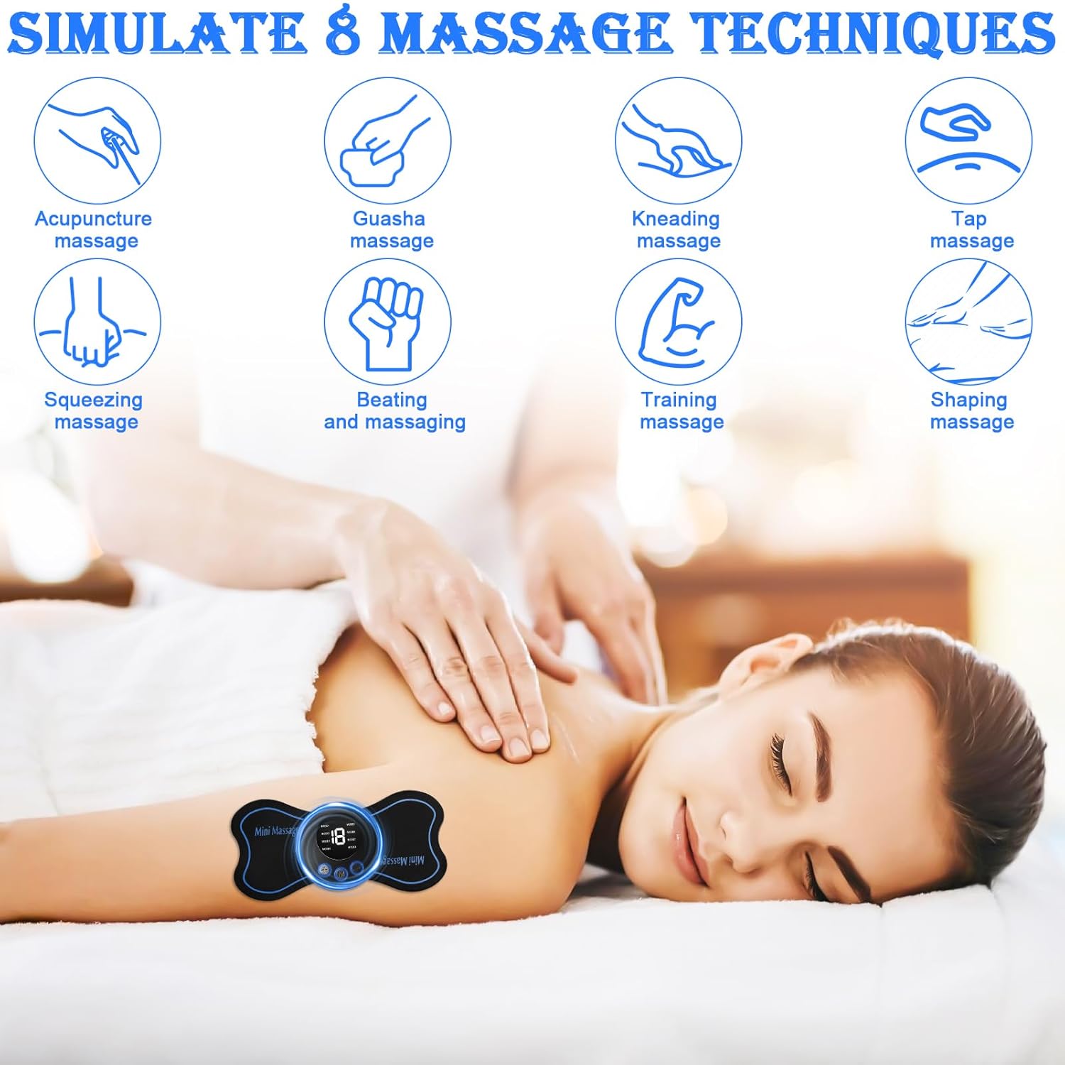 - 8 vorprogrammierte Massage-Modi: Entspannung, Massage, Kneten, Schlagen, Schaben, Wärme, Automatik, Benutzer