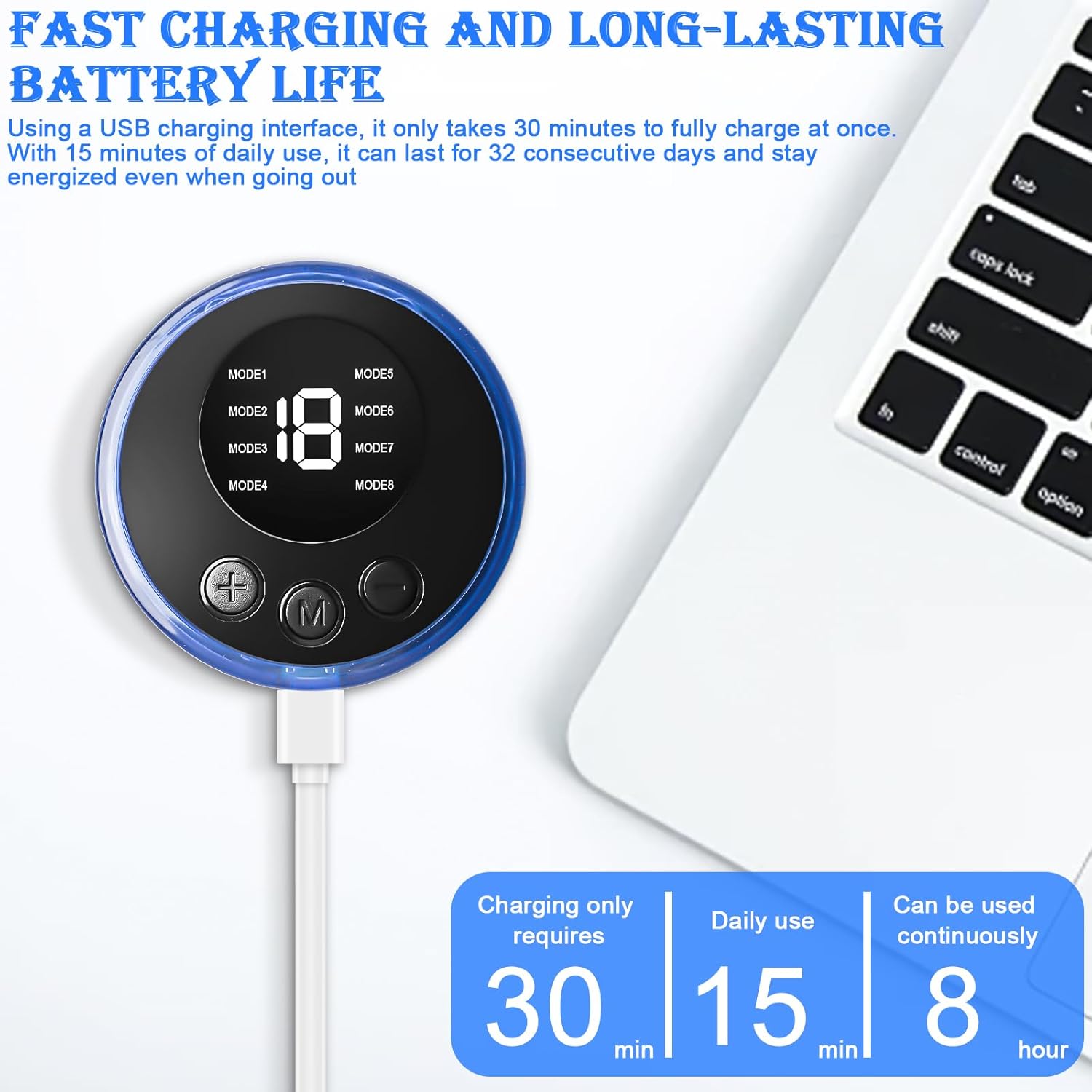 Die Massagepads selbst sind mit einem robusten Klettverschlusssystem ausgestattet, das ein sicheres und langlebiges Befestigen ermöglicht. Die Pads lassen sich problemlos abnehmen, reinigen und wieder befestigen – ein echter Pluspunkt für die Hygiene und Langlebigkeit des Geräts. Die USB-Ladebuchse ist stabil verarbeitet und ermöglicht das Aufladen mit gängigen Kabeln – sei es am Computer, am Laptop oder an einer Powerbank. Die Akkulaufzeit ist beeindruckend: Nach einer vollen Ladung können Sie das Gerät mehrere Tage lang nutzen, ohne ans Aufladen denken zu müssen. Das Gehäuse ist zudem so konstruiert, dass es Stöße und leichte Stürze problemlos übersteht – ideal für den mobilen Einsatz.