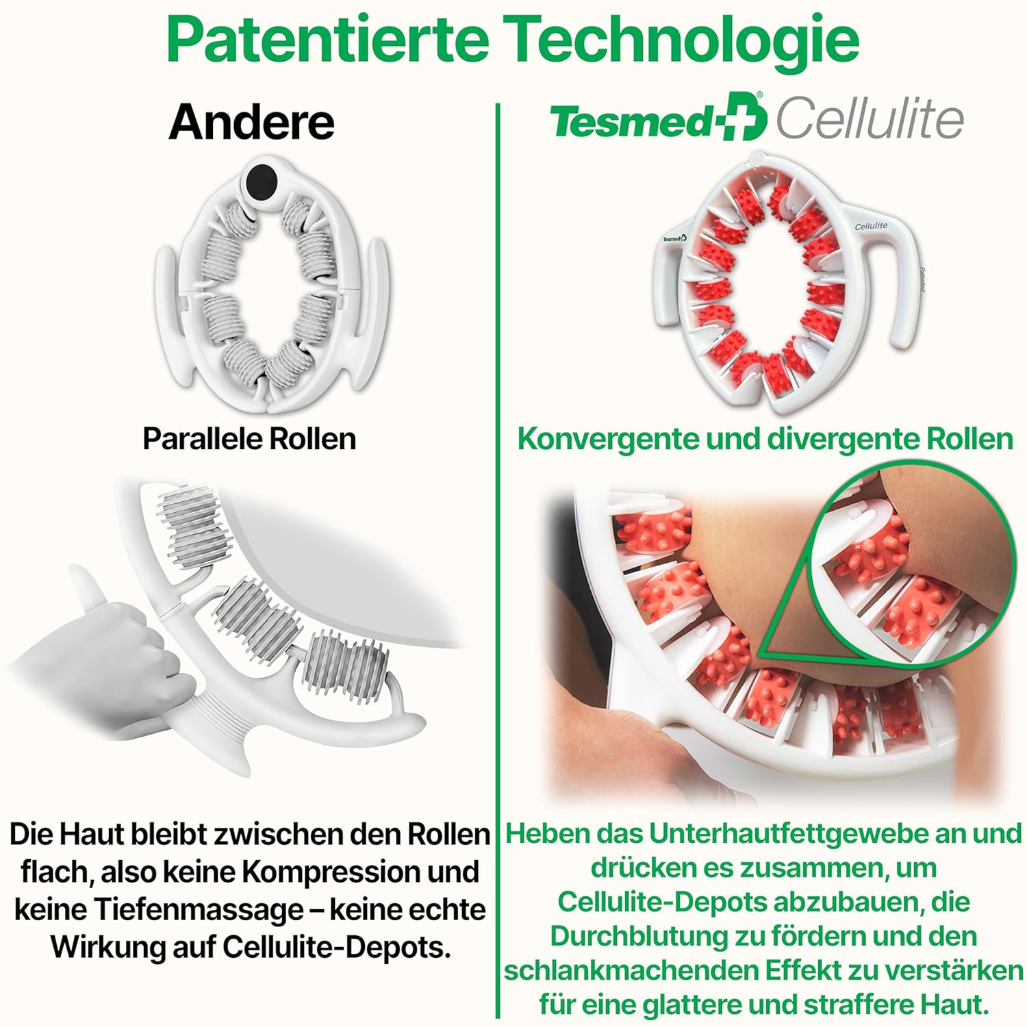 • Divergente Rollen: Glätten die Haut durch sanftes Dehnen und reduzieren optische Unebenheiten