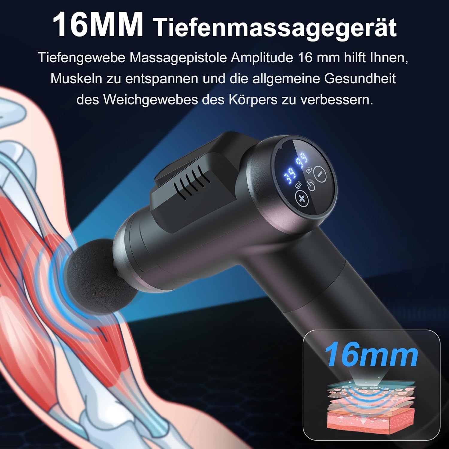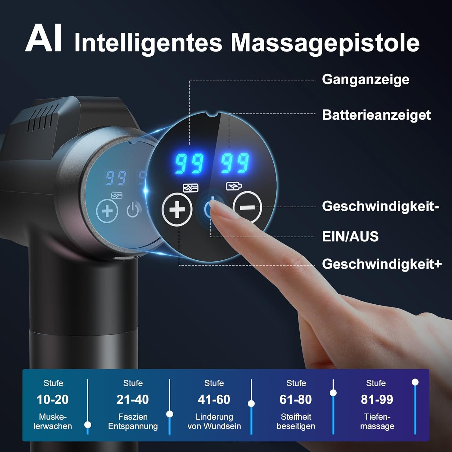 In einer Welt, in der Leistung, Termindruck und körperliche Belastung täglich an die Grenzen unserer Muskulatur gehen, ist die richtige Regeneration nicht nur ein Luxus – sie ist eine Notwendigkeit. Die Timiyou Massage Gun ist mehr als ein klassischer Massagestab: Sie ist ein hochentwickeltes, intelligentes Massagegerät, das mit beeindruckenden 99 einstellbaren Geschwindigkeitsstufen und einem leistungsstarken 9800-U/min-Motor tief in die Muskulatur eindringt, um Verspannungen zu lösen, Schmerzen zu lindern und die natürliche Regenerationsfähigkeit des Körpers zu unterstützen. Ob nach einem intensiven Training, nach langen Stunden im Büro oder nach einer anstrengenden Fahrt – diese Massagepistole bietet professionelle Entspannung auf Knopfdruck, wann immer Sie sie brauchen.