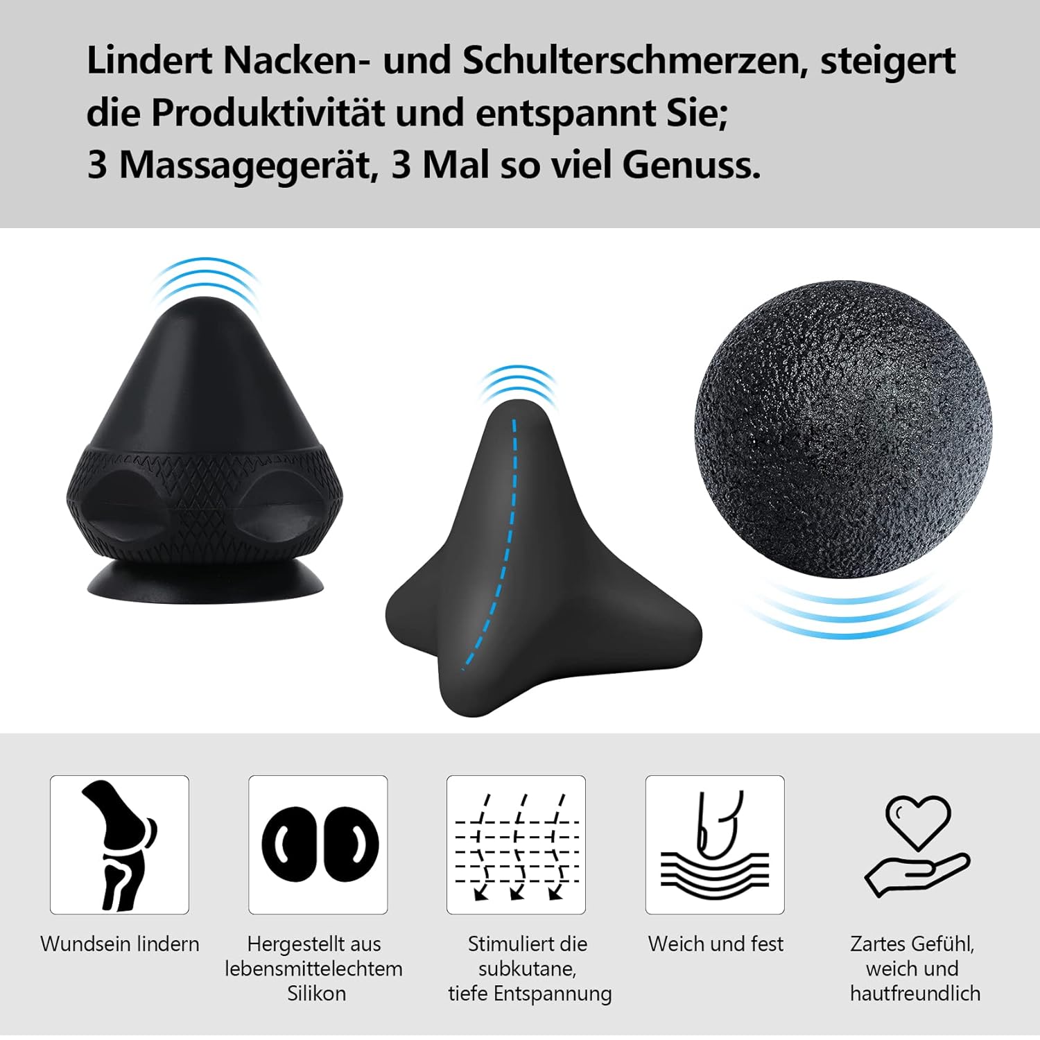 Die Kombination aus einem innovativen Squeegee-Massager mit Saugnapf, einer Trigger-Point-Kugel und einer 8-cm-Faszienrolle ermöglicht es Ihnen, jeden Muskelbereich gezielt zu bearbeiten – sogar jene Stellen, die Sie mit herkömmlichen Massagewerkzeugen kaum erreichen. Das Set ist nicht nur effektiv, sondern auch von höchster Qualität: Hergestellt aus umweltfreundlichem, hautfreundlichem Silikon, ist es wasserfest, hygienisch und absolut frei von schädlichen Weichmachern. Zusammen mit dem praktischen Grau-Samt-Zipbeutel ist das Set immer griffbereit, sauber verstaut und ideal für Reisen, Fitnessstudios oder den Home-Office-Alltag.