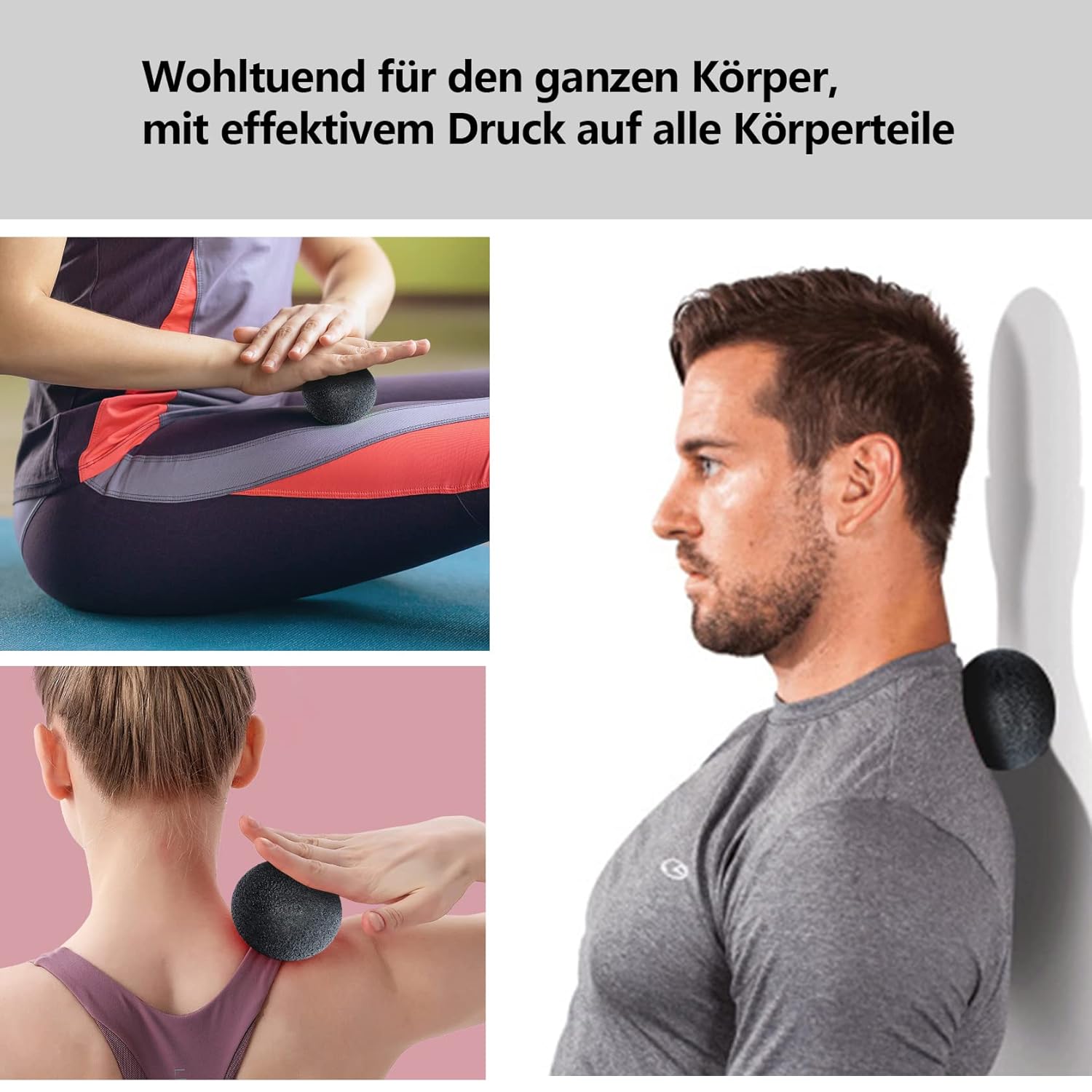 Dieses Set ist ein wahres Multitalent der Schmerztherapie. Dank seiner drei unterschiedlichen Komponenten deckt es ein breites Spektrum an Anwendungen ab – von der gezielten Triggerpunktbehandlung bis zur großflächigen Faszienentspannung. Der Squeegee-Massager mit Saugnapf ist besonders revolutionär: Er ermöglicht es Ihnen, die Hände frei zu haben, während der Massager an der gewünschten Stelle haften bleibt. Ideal für Bereiche, die Sie normalerweise nicht erreichen können – wie der obere Rücken, die Schulterblätter oder der untere Rücken. Einfach an die Wand gelehnt oder auf den Boden gelegt, fixiert der Saugnapf das Gerät sicher, sodass Sie sich mit Ihrem Körpergewicht sanft in die Verspannung pressen können. Kein Verrutschen, kein Haltewackeln – nur präzise, kontrollierte Therapie.