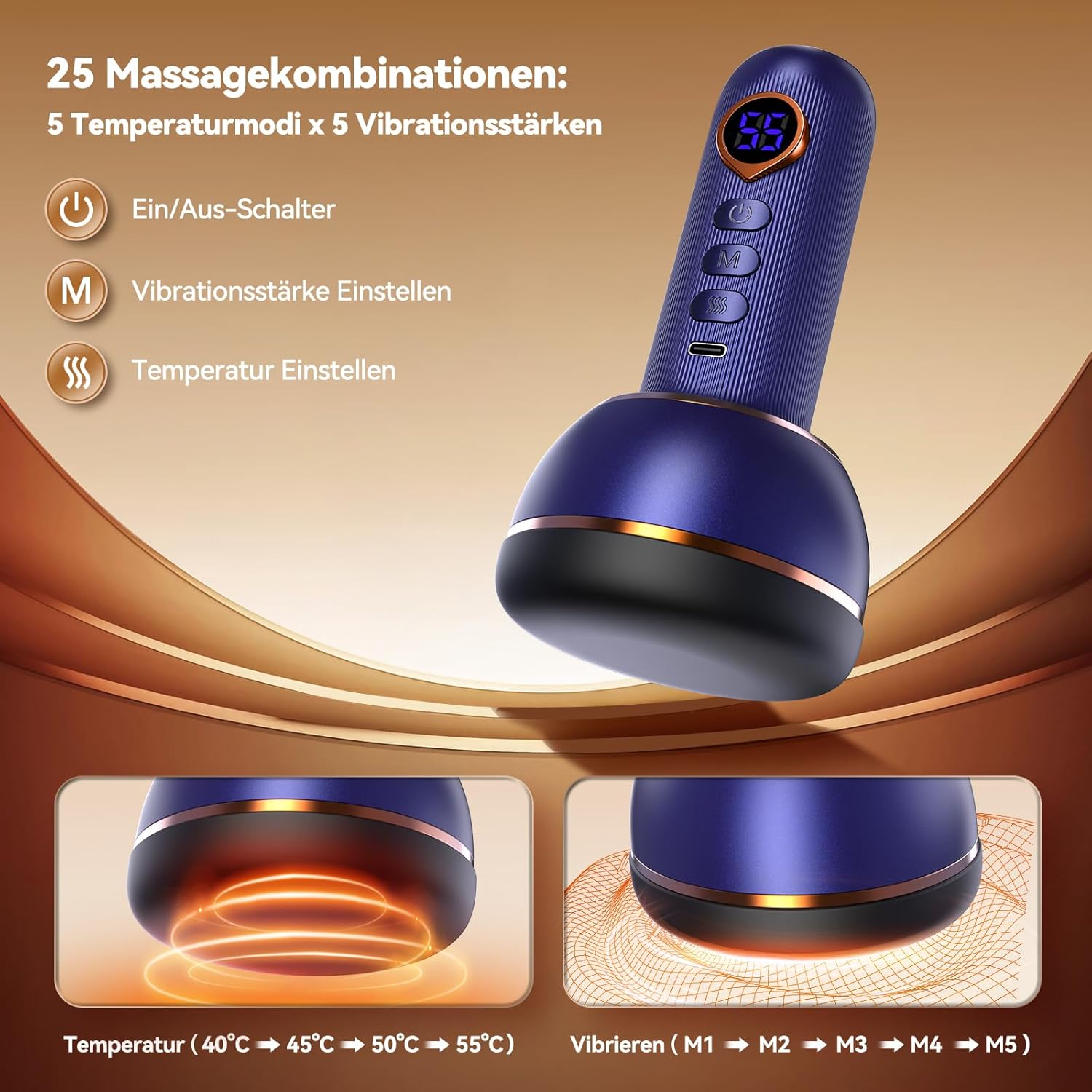 - Vibrationsstufen: 5 (unabhängig von der Wärme regelbar)