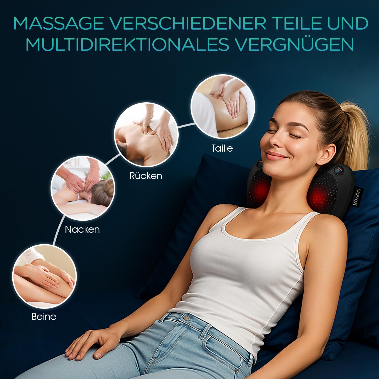 Stellen Sie sich vor, Sie kommen nach einem langen Arbeitstag nach Hause, setzen sich aufs Sofa und spüren sofortige Erleichterung für Ihren verspannten Nacken, Ihren schmerzenden Rücken oder Ihre müden Beine. Oder Sie sind auf einer langen Autofahrt und spüren, wie die Verspannungen im Nacken nachlassen, während das Massagekissen sanft die Durchblutung fördert. Mit dem VOYOR-HEALTH YZ100 Shiatsu Nacken- und Rückenmassagekissen wird diese Vorstellung zur Realität. Dieses hochwertige Massagegerät verbindet traditionelle Shiatsu-Technik mit modernster Heiz- und Rotations-Technologie, um Muskelverspannungen gezielt zu lösen, Schmerzen zu lindern und tiefe Entspannung zu schenken – ob zu Hause auf dem Sofa, im Büro auf dem Stuhl oder im Auto auf langen Fahrten.